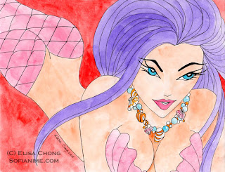 This is one of my earlier mermaid paintings, a lovely mermaid with purple hair and a light pink tail who loves to wear beautiful seashell and pearls jewelry, as she swims through the seas. It is 8.5 by 11 inches, created with watercolors too. Click HERE for more details about this painting.